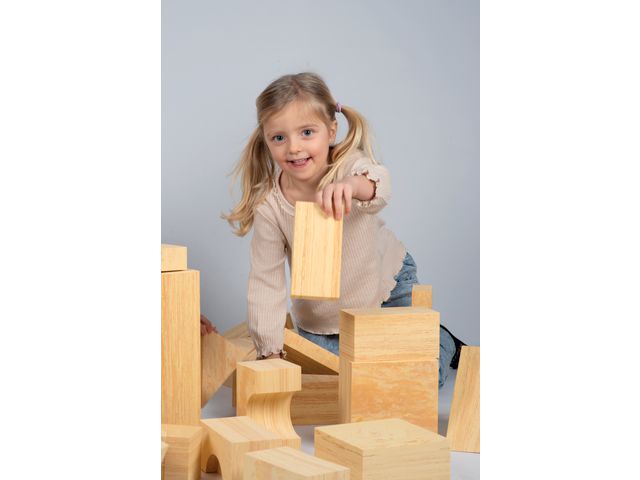 Ett set med mjuka träliknande klossar i olika former, vilket ger utrymme för kreativitet och fantasifullt byggande. Klossarna främjar inlärning inom rumsuppfattning och konstruktion. Här går lek och lärande hand i hand. Aktiviteten kan utföras ensam eller i samarbete med andra. Basmått: 8 cm (8-31 cm) Antal: 56 delar Material: EVA Passar i 1 st förvaringspåse PVC-fritt Rekommenderad ålder: från 3 år CE
