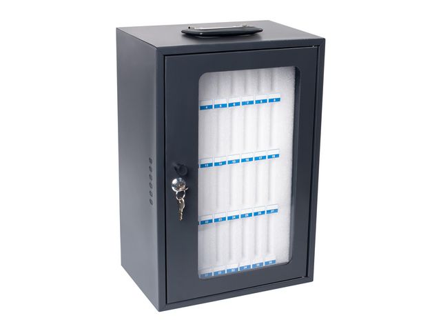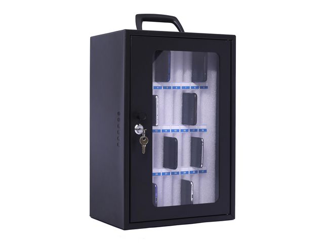 Pavos smartphoneskåp är en effektiv och säker förvaringslösning som är perfekt för förvaring av mobiltelefoner i utbildningsinstitutioner, idrottsklubbar och andra organisationer Detta förvaringsskåp av stål med en akryldörr är designat för att förvara upp till 36 smartphones på ett organiserat och repfritt sätt. Varje enhet får sin egen plats i mjuka skumfack som ger optimalt skydd och är individuellt numrerade, vilket gör att användarna snabbt och enkelt kan hitta sina telefoner. Skåpet är säkrat med ett nyckellås, vilket säkerställer säker förvaring under klasser eller träningspass. Den kan antingen fungera som ett bärbart alternativ eftersom den är utrustad med ett handtag eller vara väggmonterad för ökad säkerhet och utrymmesbesparingar. Skåpet är mycket lämpligt för att tillfälligt förvara smartphones på skolor, kliniker och andra områden där telefoner inte får tas med. 0,8 mm massiv stålkonstruktion med akryldörr Cylinderlås med två nycklar Monterbar Bärbar Mått (HxBxD): 445 x 295 x 205 mm Mått på facken (HxBXD): 85 x 10 x 105 mm Vikt: 4 kg