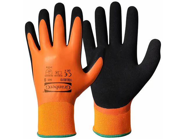 Vattentäta montagehandskar med dubbel latexbeläggning som ger vätsketäthet och bra grepp i innerhanden. Lämpliga för lätt till medeltungt arbete i våta miljöer. Med elastisk mudd för bra passform runt handleden. Svart sandaktig latex i innerhanden säkerställer ett bra grepp och den tunna latexbeläggningen gör handskarna mycket mjuka lätta och bekväma samt ger god fingerkänsla. Bra torr-och våtgrepp. Produkten är CE-märkt. Godkända enligt: EN 388:2016+A1:2018, EN ISO 21420:2020 Skyddsklass: II Material: polyester, latex Längd: 24-29 cm CE-märkt Storlek: 9