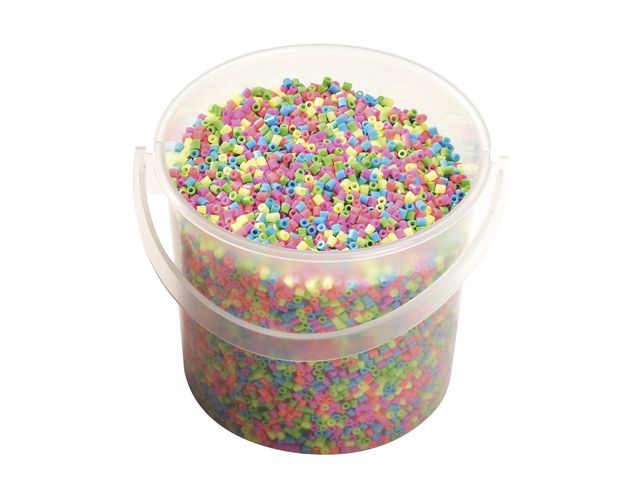 Pärlor i blandade pastellfärger för pärlplattor eller annat pyssel. Dessa fina nabbipärlor i blandade pastellfärger passar perfekt för olika sorters pärlplattor eller pyssel, pärlorna kan strykas eller limmas fast och levereras i en praktiskt hink. Vid strykning, som bör utföras av en vuxen, används lämpligen smörpapper mellan strykjärnet och pärlorna. Ställ strykjärnet på hög värme och för det fram och tillbaka tills pärlorna smält samman. Mått: ø 5 mm rörpärlor, håldiameter 2,5 mm Material pärlor: Polyeten, PVC-fri Material hink: Polypropen Varning. Lämpar sig inte för barn under 3 år CE-märkt