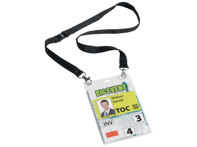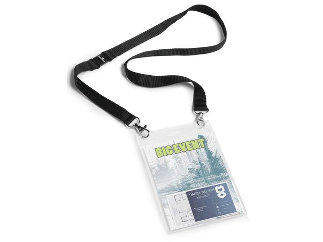 En namnskylt som är perfekt på mässor, kongresser, VIP-tillställningar eller stora event Det här är en A6- ficka av polypropylen med visitkortsficka på baksidan, komplett med 2 cm brett textilhalsband med säkerhetsöppning och två karbinhakar. Dubbla karbinhakar gör att skylten alltid hänger rakt så att deltagarna ser namnet på varandra. Halsbandet är 100 cm inkl hakarna och bara textilbandet är 88 cm. Vita etiketter i en remsa medföljer. Etiketter på A4-ark för utskrift i skrivare kan beställas separat. Använd gratisprogrammet DURAPRINT som finns på www.duraprint.se för att skapa och skriva ut snygga namnetiketter. Event-namnskylt A6 av PP-plast med textilhalsband Med extra ficka för visitkort Bandet är stadigt fastsatt med dubbla karbinhakar och säkerhetsspänne som öppnas vid för stark belastning Perfekt på mässor, kongresser, VIP-tillställningar eller stora event Textilhalsbandets: 88 cm x 20 mm (L x B)