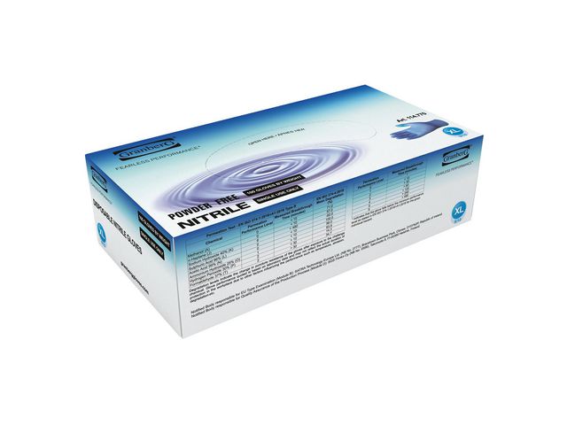 Kemikalieresistenta handskar i nitril för engångsbruk. Godkända för användning i direkt kontakt med alla typer av livsmedel, inklusive livsmedel med hög fetthalt (EN 1186). Puderfria engångshandskar som är starka och elastiska. De har en mikroruggad ytstryktur på fingertopparna för bättre grepp. Lämpliga för arbete inom HoReCa, livsmedelsindustri, tillverkningsindustri, säkerhet, butik, underhåll, anläggning, kemikaliehantering (enligt test) samt rengöring. - CE-certifierad - Puderfria - Vattentäta - Beständighet mot fett, rengöringsmedel, kemikalier (EN374). - Godkända för användning i direkt kontakt med alla typer av livsmedel, inklusive livsmedel med hög fetthalt (EN 1186). - Godkända för medicinsk användning (EN455). - Vikt 5,8 ± 0,2 g. - Färg: Blå - Storlek: