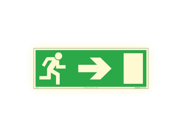 Färgefterlysande skylt i aluminium som visar närmsta nödutgång. Symboler och utformning enligt AFS 2023:12, med betydelsen 'Härifrån till höger'. Supernova® är en yta som efterlyser i mörker, både i skyltens varselfärg och i symbolens vita färg. Supernova® kvaliteten uppfyller kravet i AFS 2023:12 om att skyltar ska ha efterlysande färger, reflekterande material eller artificiell belysning där dagsljus är otillräckligt. Supernova® skyltar är lämpliga för inomhusbruk. Supernova laddas upp av allt typ av ljus och den efterlysande färgen håller i sig upp till åtta timmar. Under Dokument och video hittar du tips på vad du bör tänka på när du väljer skyltstorlek. Storlek: 420 x 148 mm Material: 98 % Pre-consumer återvunnet aluminium