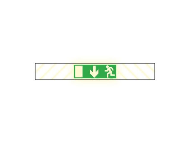 Färgefterlysande dörrskylt som visar vart nödutgången är. Supernova® är en yta som efterlyser i mörker, både i skyltens varselfärg och i symbolens vita färg. Supernova® kvaliteten uppfyller kravet i AFS 2023:12 om att skyltar ska ha efterlysande färger, reflekterande material eller artificiell belysning där dagsljus är otillräckligt. Supernova® skyltar är lämpliga för inomhusbruk. Mått: 800 x 105 mm Material: 98 % Pre-consumer återvunnet aluminium