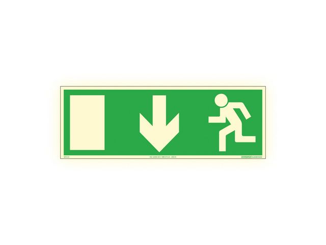 Färgefterlysande skylt i aluminium som visar närmsta utrymningsväg. Symboler och utformning enligt AFS 2023:12, med betydelsen 'Fortsätt rakt fram' och 'Fortsätt rakt fram och när skylten är placerad över en dörr, genom denna'. Supernova+® är en patenterad färgefterlysande arbetsmiljöskylt med internationellt godkända piktogram enligt ISO 7010. Skylten återger korrekta signalfärger i både dagsljus och mörker enligt ISO 3864. Supernova+® lyskraft är mycket stark och överskrider minimumkraven i ISO 16069. Supernova laddas upp av allt typ av ljus och den efterlysande färgen håller i sig upp till åtta timmar. Under Dokument och video hittar du tips på vad du bör tänka på när du väljer skyltstorlek. Storlek: 420 x 148 mm Material: 98 % Pre-consumer återvunnet aluminium