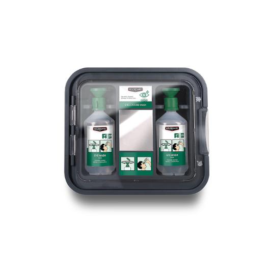 En station särskilt framtagen för ögonskador, utrustad med två flaskor ögonskölj på 500 ml. Stationen är lättöverskådlig och snabb att använda, med en lucka försedd med gummilist som skyddar innehållet mot damm och smuts. I mitten finns en spegel som underlättar för användaren att själv skölja ögat effektivt. Ögonduschstationen är anpassad för miljöer där det finns risk för stänk och partiklar som kan skada ögonen. Med två flaskor ögonskölj finns tillräcklig mängd vätska för noggrann och effektiv sköljning. Den integrerade spegeln gör det enklare för användaren att snabbt lokalisera och skölja det skadade ögat. Ögonsköljflaskorna är avsedda för uppvärmda lokaler där de håller rumstemperatur (ca 18-25 °C) för omedelbar användning, enligt kraven i AFS 1999:7. Med ett enkelt refillsystem där du kan fylla på produkter utan att behöva verktyg. Produkten är CE-märkt. Innehåller: 2 x ögonskölj, 500 ml Väggskylt 'Ögonskölj' 200 x 200 mm (inkl. skruvar och plugg) Mått (LxBxH): 95 x 340 x 410 mm Vikt: 2,67 kg CE-märkt