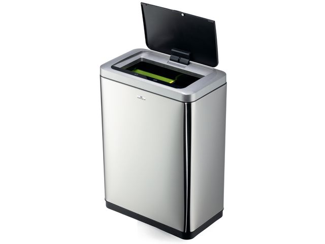 Högkvalitativ papperskorg med sensorteknik för kontaktlös användning. Papperskorg med mjukstängande sensorstyrt lock erbjuder bekväm och hygienisk hantering av en sluten avfallsbehållare. Öppnas genom att föra handen över locket, stängs automatiskt efter 5 sekunder med synlig nedräkning. Kan även användas manuellt. Två borttagbara innerbehållare med påsfixering, perfekt för sopsortering och återvinning. Avtagbart lock för enkel tömning. Av rostfritt stål med en yta som skyddar mot fingeravtryck,halkfri sockel. Enkel och hygienisk drift Mjukt stängande lock Rostfritt stål med antifingeravtrycksbeläggning Rymmer 2x20 liter Mått: 46 x 65 x 27 cm (B x H x D) Drivs med 4st AA-batterier (ingår ej)