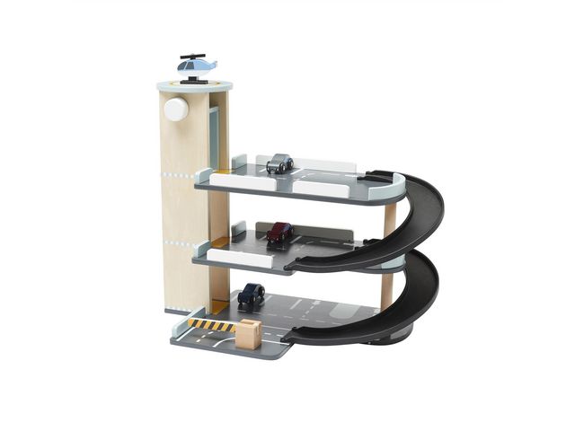 Parkeringshus i trä i tre våningar med tre medföljande bilar, 1 helikopter och helikopterplatta på toppen. Parkeringshuset har vridbar bom och en hiss som kan vridas upp och ner, motiv av parkeringsplatser och ramper. Inspirerar till fantasifull och rolig lek samt utvecklar barnets finmotorik och hand- öga koordination. Material: trä Mått: 52 x 31 x 45 cm Rekommenderad ålder: från 3 år CE