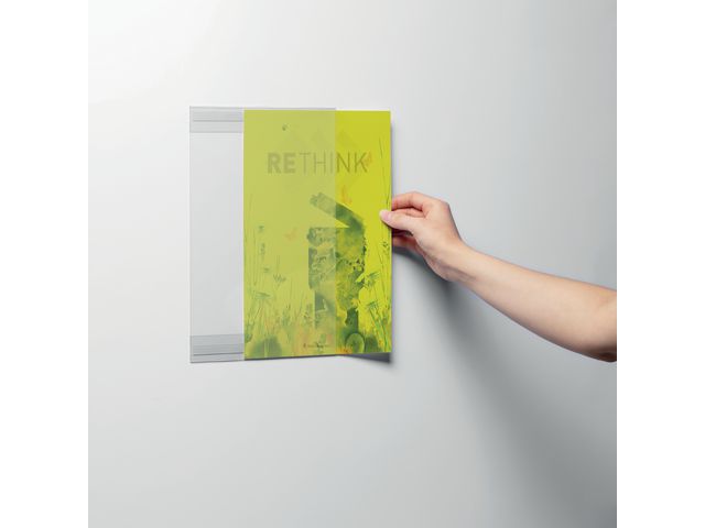 Självhäftande ficka med glasklar front utan tryck Visar och skyddar inlagan med information på t ex mässor, gym, kontor, i butiker, klassrum och väntrum. Glasklar front utan tryck, med vikt över- och underkant, som bildar en profil, som pappret skjuts in i från sidan. De två självhäftande tejpremsorna fäster permanent på rena och fasta ytor, även lite ojämna underlag. Självhäftande ficka av 80% post-consumer återvunnen rPET plast. För dokument i A4 stående format Mått: 211x299 mm Påse med 5 st Tillverkad av 80% post-consumeråtervunnen rPET plast
