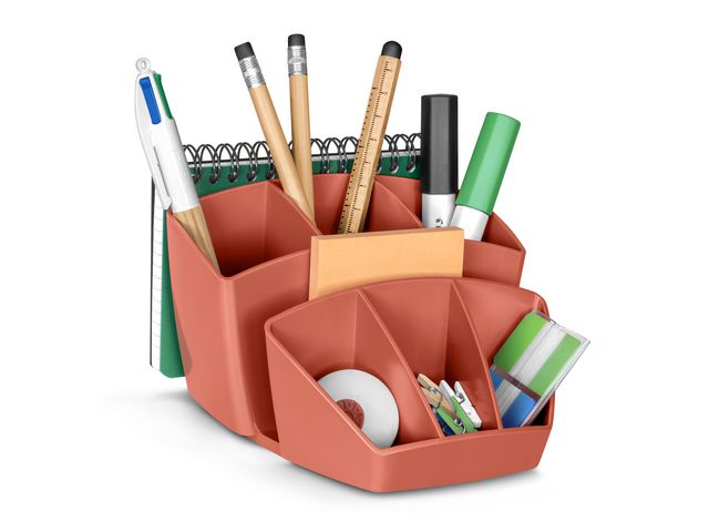 Perfekt för att hålla pennor och skrivbordstillbehör organiserade. Praktiskt prylställ med åtta separata fack för enkel sortering. Den stilrena designen ger ett fräscht och modernt intryck. Kapacitet: 8 fack Färg: orange 94% post consumer återvunnen plast Blue angel