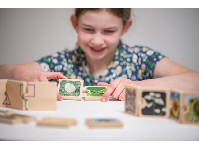 Lär barnen om livscyklerna hos en kyckling, groda, fjäril, bondböna, solros och ek genom att placera de fyra brickorna i rätt ordning. Alla brickor är självrättande med det korrekta mönstret tryckt på undersidan av varje bricka. Värmeöverförda bilder med fotografier från verkligheten som är mycket slitstarka. Mått per bit: 60 x 60 x 10mm Antal bitar: 24 Rekommenderad ålder: från 3 år FSC