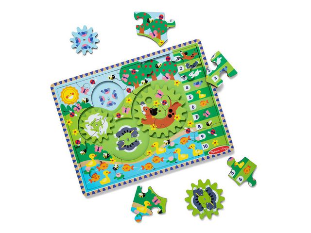 Sätt ihop ett träpussel med 24 bitar med djurtema och 4 sammankopplade kugghjul som snurrar. Det finns bilder på pusselbrädan under bitarna för enkel matchning. Innovativ design som är unik på marknaden - kugghjulsbitar passar över pinnar på pusselbrädet för att s kapa 3 kugghjul. Material: Trä PVC fritt från 3-5 år Rekommenderad ålder: från 3 år