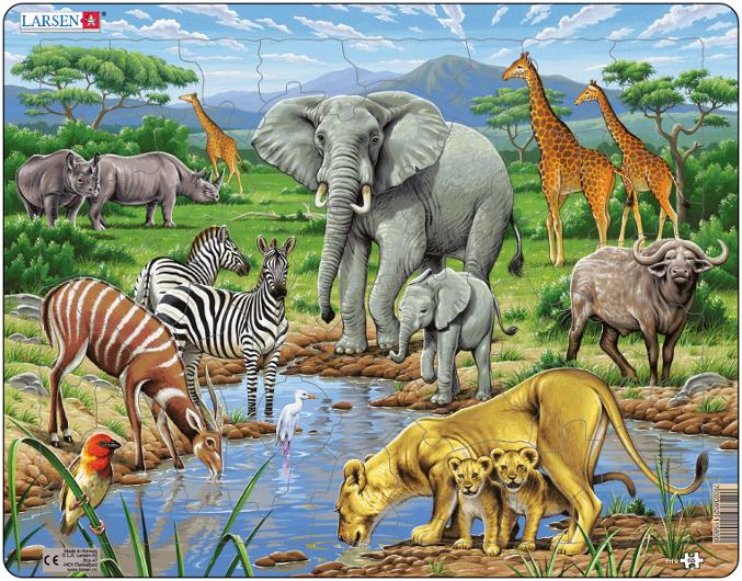 Upptäck savannen – pussla Afrikas vilda djur! Ta med barnen på ett äventyr till Afrikas savann med Larsen Maxi-pussel. Detta 65-bitars pussel visar ikoniska djur och landskap från den afrikanska naturen. Perfekt för barn som älskar djur och vill lära sig mer om världens ekosystem på ett roligt och pedagogiskt sätt. Antal bitar: 65 Mått: 36,5 x 28,5 cm Rekommenderad ålder: från 6 år