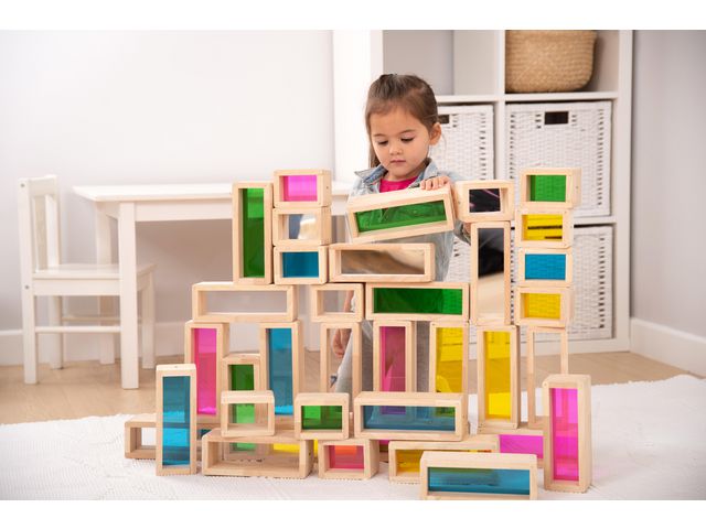 Gigantiska, visuellt imponerande byggklossar tillverkade av vackert gummiträ med färgglada transparenta akrylinlägg. Kan användas för att bygga och stapla med dubbla och halva storleksklossar. Setet innehåller 36 delar (24 stora, 12 små) med avrundade hörn och färgglada inlägg (röda, gröna, blåa, gula, genomskinliga och speglade). Barnen kommer att hålla dem mot sina ögon för att se en värld i olika färger. Kan även användas för färgblandning och på en ljuslåda. Stödjer följande inlärningsområden: Personlig utveckling - sensorisk Fysisk utveckling - konstruktion Förståelse av världen - observation Förståelse av världen - färg Storlek på stor kloss: 200 x 75 x 75mm. Storlek på liten kloss: 100 x 75 x 75mm. Paket om 36 delar Rekommenderad ålder: från 1 år Material: Akryl & Gummiträ FSC 100%