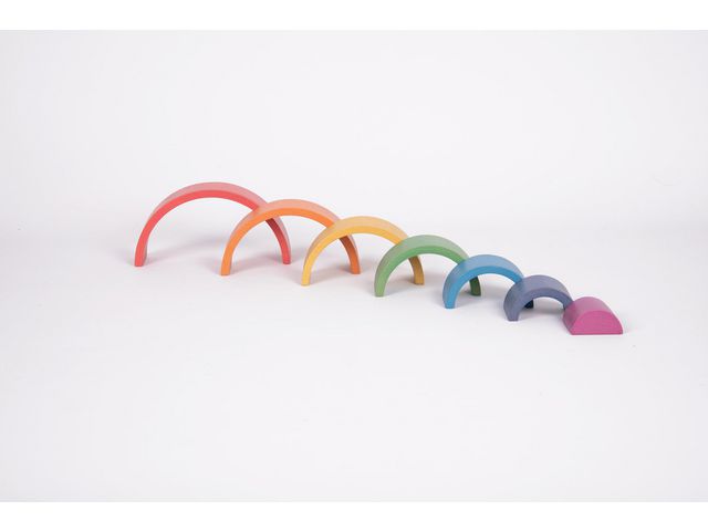 Byggset i trä där bitarna tillsammans skapar en vacker regnbåge Byggset i trä där bitarna tillsammans skapar en vacker regnbåge. Bitarna kan användas som t.ex. tunnlar och broar tillsammans med andra typer av klossar. Yngre barn kan stapla och sortera klossarna. Tränar fingermotoriken och skaparglädjen. - Mått: höjd 73, 63, 56, 47, 36, 27 samt 19 mm, djup 4 cm. - Material Trä - Lämpliga från 1 år.