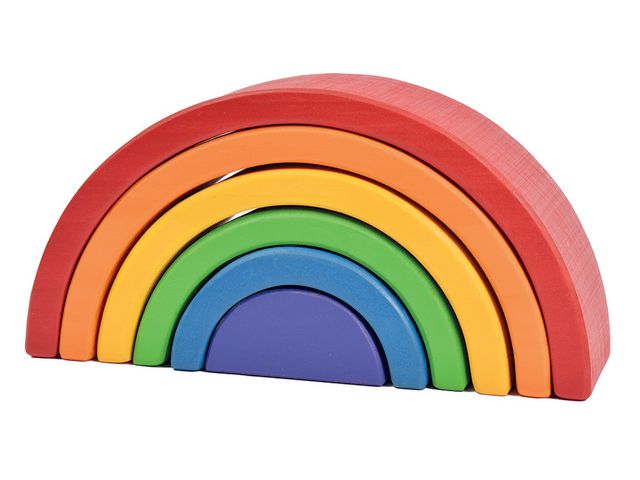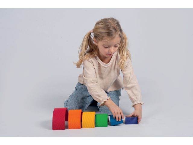 Regnbågsklossar, 6 st. Byggset i trä där bitarna tillsammans skapar en vacker färgglad regnbåge. Bitarna kan användas som t.ex. tunnlar och broar tillsammans med andra typer av klossar. Stapla klossarna på varandra och sortera dem efter färg och storlek. Främjar färglära, kreativitet och motorik. Rekommenderad ålder: +1år FSC-trä