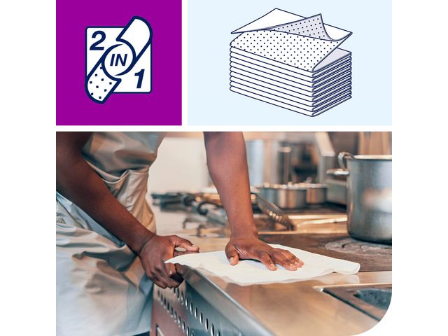 Förbättra effektiviteten vid städning med denna 2-i-1 skur- och rengöringsduk. Duken är både slitstark och absorberande för att klara av envisa fläckar, samtidigt som den har en design som är skonsam mot ytor och förhindrar repor. Den är dessutom flexibel, vilket gör att den enkelt kan rengöra svåråtkomliga platser. Dessa skur- och rengöringsdukar kan återanvändas upp till 10 gånger för att minska avfallet. Undvik skador på bordsskivor, tack vare professionella och högkvalitativa design som rengör utan att repa ytor. Kompatibel med Tork W8 dispensrar. Rengör utan att repa ytor Kan sköljas av och återanvändas flera gånger 1-lagers vit Premium-kvalitet Vikt storlek: D 19.3cm x B 15cm Ovikt storlek: D 38.5cm x B 30cm Material: bomull och viskos FSC 100 % Livsmedelsgodkänd