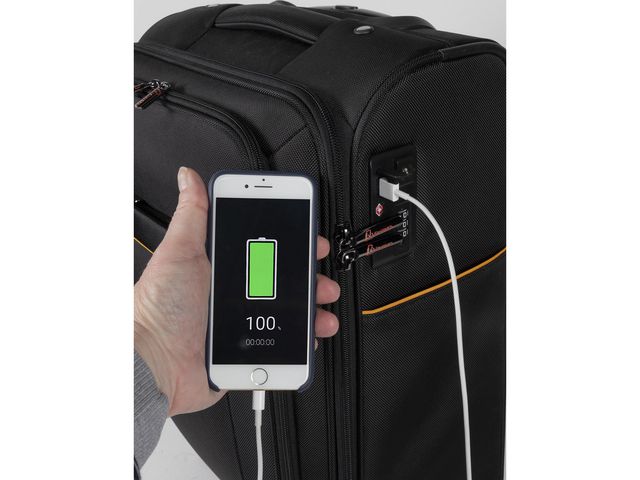 En resväska med hjul, kompatibelt handbagage för de flesta flygbolag. Lätt att hantera tack vare de 4 flersidiga riktningshjulen och det bekväma teleskophandtaget. Rymlig interiör med korsband, avtagbar transparent toalettväska för enkel flygplatskontroll, separata vadderade laptopfickor upp till 15,6 och surfplatta. Bagaget kan säkras med det inbyggda TSA-låset. Etikett för identifiering av ägaren ingår också i påsen. Ladda enkelt en telefon eller surfplatta med USB-portar och integrerade kablar inuti fodralet (2 USB-portar och 1 mikro-USB-port integrerad, laddare medföljer inte). Reglerar certifiering av återvunnet material. Tillverkad av 29% post-consumer återvunnet material. Material: Polyester Mått: 37 x 55 x 23 cm Vikt: 3,8 kg GRS (Global Recycling Standard) Tillverkad av 29% post-consumer återvunnet material