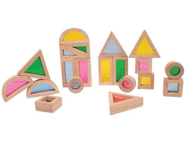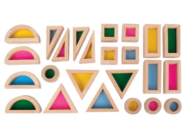 Trä- och akrylklossar i olika former (rektangel, cirkel, kvadrat, triangel och halvcirkel). Klossarna är utrustade med färgglada insatser som skapar en visuell effekt. Genom att kombinera klossarna på olika sätt skapas en mångfald av färger och mönster. Akrylklossarna är perfekta för att experimentera med färgblandning på ljusbord eller att träna på motorik och konstruktion. Upptäck kreativitet och variation med detta set som inkluderar 24 klossar i olika former och färger. Mått rektangel: 10 x 5 x 2,5cm Material: trä och akryl Rekommenderad ålder: från 3 år