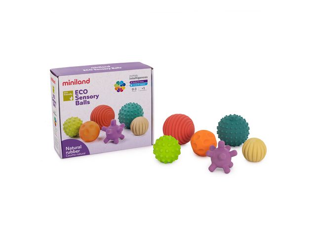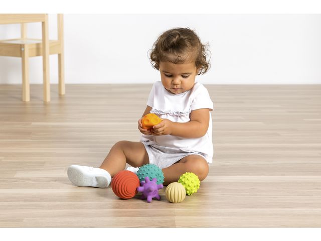 Set med sensoriska bollar av naturgummi. Tillverkade av mjukt naturgummi vilket gör dem mycket lätta att greppa och lämpliga ffrån spädbarnsålder. Deras olika färger och texturer förbättrar sensorisk stimulering – både taktil och visuell – och bidrar till utvecklingen av barns motorik. Rekommenderad ålder: från 0 år
