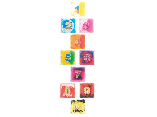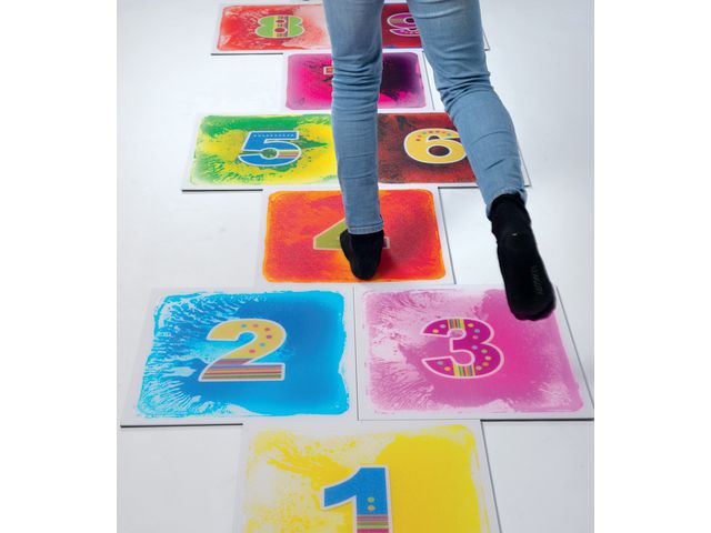 Sensoriska golvplattor, hopphage med siffrorna 1-10. En sensorisk upplevelse som uppmuntrar till rörelse och upptäckarglädje. Hoppa, pressa och tryck på plattorna och se hur vätskan inuti skapar förändliga mönster. Plattorna kan även användas på ett bord. Mått: 40 x 40cm