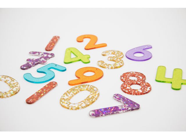 En uppsättning av 14 gnistrande glittrande siffror 0-9 tillverkade av färgglada translucenta 3 mm akryl. Setet inkluderar två stilar av siffrorna 4 och 7, med en extra 1 och 0. Idealiskt för användning på en ljuspanel för att främja sifferigenkänning. Siffrorna har en 2,5 mm hål vid balanspunkten på toppen så att de kan hängas upp mot ett fönster eller utomhus för att skapa fascinerande färgglittrande skuggor. Stödjer följande inlärningsområden: Matematik - nummer Förståelse för världen - färg Fysisk utveckling - motoriska färdigheter Förpackning om 14 Mått: 70 mm Material: Akryl