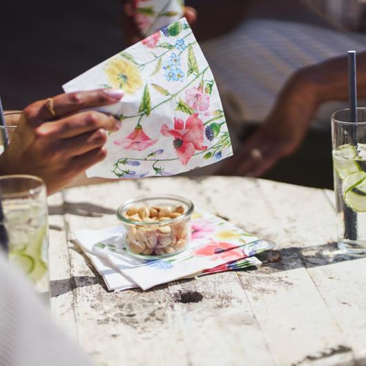 Servett med motiv av klassiska sommarblommor för en vacker dukning. En praktisk servettstorlek för alla typer av dukningar. Det funktionella valet, perfekt för informella frukostar, luncher och mellanmål. Ju fler lager, desto bättre hållbarhet. Miljömärkt med FSC och Svanen. Komplettera gärna med fler artiklar i samma serie för en komplett dukning. Mått: 33 x 33 cm 3-lags FSC Mix Svanen: licensnummer 3005 0013 Produkten är godkänd för kontakt med livsmedel