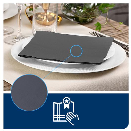 Vackra pappersservetter med en underbar linnekänsla som ger ett elegant intryck! Gör ett gott första intryck med högkvalitativa Tork LinStyle Middagsservett. Dessa servetter ger ett lyft till middagsupplevelsen eftersom de både ser ut och känns som premiumlinne. Dessutom är de mjukare och tjockare än vanliga pappersservetter, så gästerna kommer att märka skillnad. Spill torkas enkelt upp på ett ögonblick med den extra absorberande kvaliteten som sparar personalen både tid och ansträngning. Överlägsen absorptionsförmåga vid upptorkning av spill Matcha din lokals inredning med brett urval av moderna och klassiska färger. Hållbar nonwoven-kvalitet 1-lagers, antracit Premiumkvalitet 1/4-vikt Vikt storlek: D 19.5 cm, B 19.5 cm Ovikt storlek: D 39 cm, B 39 cm FSC MIX Livsmedelsgodkänd