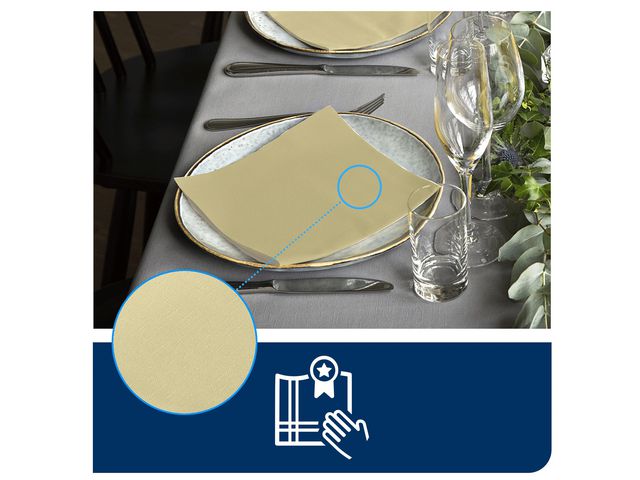 Vackra pappersservetter med en underbar linnekänsla som ger ett elegant intryck! Gör ett gott första intryck med högkvalitativa Tork LinStyle Middagsservett. Dessa servetter ger ett lyft till middagsupplevelsen eftersom de både ser ut och känns som premiumlinne. Dessutom är de mjukare och tjockare än vanliga pappersservetter, så gästerna kommer att märka skillnad. Spill torkas enkelt upp på ett ögonblick med den extra absorberande kvaliteten som sparar personalen både tid och ansträngning. Överlägsen absorptionsförmåga vid upptorkning av spill Matcha din lokals inredning med brett urval av moderna och klassiska färger. Hållbar nonwoven-kvalitet 1-lagers, champagne Premiumkvalitet 1/4-vikt Vikt storlek: D 19.5 cm, B 19.5 cm Ovikt storlek: D 39 cm, B 39 cm FSC MIX Livsmedelsgodkänd