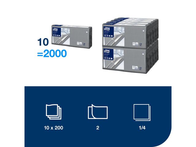 Servetter i lunchstorlek som möter funktions- och kostnadskrav, perfekta för lättare måltider eller snacks. Uppfyll dina krav på funktion utan att överskrida budgeten med Tork Lunchservetter i två lager. Den praktiska lunchstorleken är perfekt för miljöer där lättare måltider eller snacks serveras. Den kraftigare konstruktionen i dessa restaurangservetter gör dessutom att de är absorberande nog för att snabbt och enkelt torka upp spill från mat och dryck. Mixa och matcha bland flera moderna och klassiska färger för en personlig dukning. 2-lagers, grå Antal: 200st/fp Advanced-kvalitet Vikt storlek: D 16.4 cm x B 16.3 cm Ovikt storlek: D 32.8 cm x B 32.5 cm 1/4-vikt FSC MIX Livsmedelsgodkänd EU Ecolabel: licensnummer SE/004/001