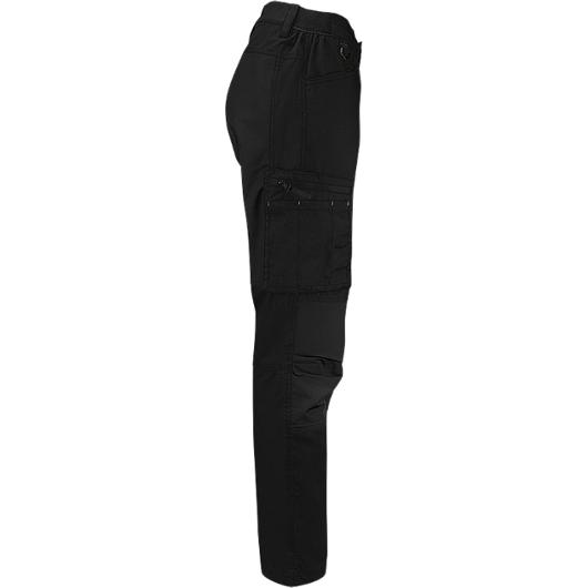 Snygg servicebyxa i dampassform för dig som arbetar med installation, hantverk och service. En modern servicebyxa som kombinerar stilren design med hög funktion och slitstyrka. Byxan är tillverkad i en blandning av återvunnen polyester och bomull, med 4-vägsstretch i utvalda paneler för ökad rörlighet vid arbete i varierande positioner. Genomtänkta detaljer som dragkedjeförsedda benfickor och magnetlås på ficklock gör byxan både praktisk och effektiv i det dagliga arbetet. Smarta ficklösningar ger säker förvaring av verktyg och mobiltelefon, vilket gör byxan väl anpassad för ett högt arbetstempo. Material: 65% återvunnen polyester, 35% bomull Vikt: 185 g/m2 Tvättråd: 60° normal maskintvätt Passform: Dam Färg: Svart