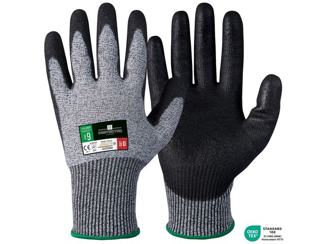 Montagehandskar, Protector, lämpliga för arbete inom montering, transport, underhåll, industri, anläggning och lager där vassa material eller verktyg hanteras. Skärskyddshandske som andas och ger ett bra torrgrepp och en god fingerkänsla. med hög rivhållfasthet och nötningsmotstånd. Godkända enligt: EN 388:2016+A1:2018 4X42D, EN ISO 21420:2020, OEKO-TEX® 100 CE-märkta Skyddskategori: II Material: Typhoon® med PU-beläggning Storlek: 9