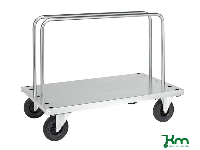 Praktisk bromsad skivvagn för de tyngre lasterna. Tillverkad av elförzinkad plåt. Med plats för 7 byglar, levereras med 2 flyttbara byglar. Belastning: 500 kg Storlek: 1250 x 700 x 945 mm (LxBxH) Höjd till plattform: 265 mm Avstånd mellan byglar: 77 mm Gummihjul 200 x 50 mm Vagnens vikt: 44,5 kg Bromsade hjul: ja Hjultyp: 2 fasta, 2 länkhjul med broms 25 % Post-consumer återvunnet material