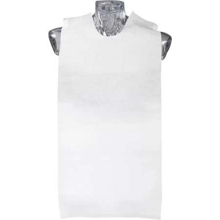 Engångshaklapp med urringning, avsedd för tandvården. Den absorberande ytan och den vätsketäta baksidan håller kläderna under rena och torra. Produkt