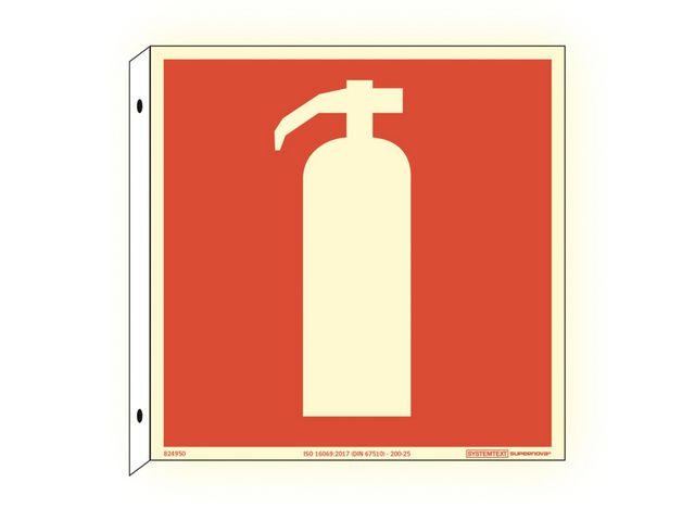 Dubbelsidig, färgefterlysande flaggskylt som visar att det finns brandsläckare där skylten sitter. Supernova® är en yta som efterlyser i mörker, både i skyltens varselfärg och i symbolens vita färg. Supernova® kvaliteten uppfyller kravet i AFS 2023:12 om att skyltar ska ha efterlysande färger, reflekterande material eller artificiell belysning där dagsljus är otillräckligt. Supernova® skyltar är lämpliga för inomhusbruk. Supernova laddas upp av allt typ av ljus och den efterlysande färgen håller i sig upp till åtta timmar. Storlek: 210 x 210 mm Material: 98 % Pre-consumer återvunnet aluminium