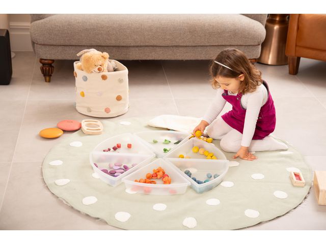 Halvgenomskinliga vita brickor tillverkade av slät och hållbar polypropylen, utformade för att passa i fri lek på ett ljusbord, bord eller golv. Mångsidiga användningsområden inkluderar sortering och arrangemang, kladdig lek, transport och hällning, skapande av miniatyr små världsscener, samt färg- eller sensorisk utforskning. Brickorna är lätta att rengöra och staplas och läggs snyggt för praktisk förvaring. Stödjer följande inlärningsområden: Personlig utveckling - samarbetslek, sensorisk Förståelse för världen - observation, utforskning Fysisk utveckling - motoriska färdigheter Matematik - sortering Mått: 315 x 272 x 120mm Material: PP