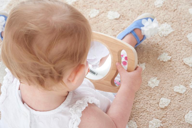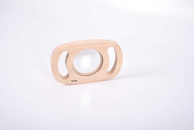 Spegel med trähandtag som är mycket lätt att greppa för de yngre barnen. Där en sida är konkav och en sida är konvex. Mått: 18x12 cm. Spegel i akrylplast ø 8 cm. Ram av gummiträ. Av FSC-märkt trä. PVC-fri. Från 1 år. FSC 100%