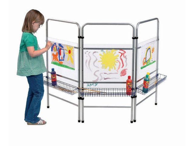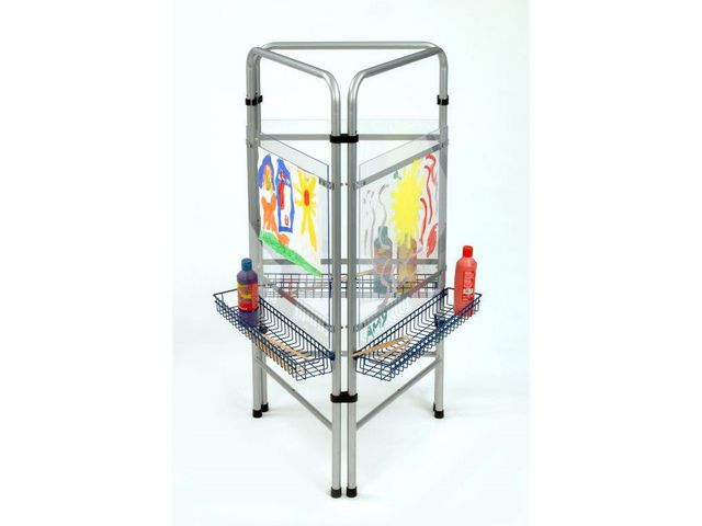 Tresidigt staffli för utomhusbruk. Lätt att vika ihop och flyttbar konstruktion med tåligt pulverlackat metallstativ. Plast fötter på alla stativ för att minska förslitning och för att stå stadig utan att glida. Paneler i akrylplast är transparenta och fungerar för både tejp och plastclips. Panelerna kan placeras i två höjder. Det går att måla direkt på panelerna med avtvättningsbar färg. De är lätt att rengöra efter vändning men följ alltid anvisningar för rengöring för den färg som används. 3 st kraftiga förvaringshyllor för alla 3 sidor i pulverkackerad metall, för färg, kritor, verktyg m.m. medföljer och fästs på panelerna. Stafflin kan vikas samman för att spara utrymme. Man kan ta isär de 3 sektionerna och man kan även koppla ihop den med fler paneler. Om man tex har 2 set så kan man koppla ihop till ett sexsidigt staffli. Mått per sektion: B59xH124xD3 cm Mått plexiglas: B56xH54 cm <li>Original art.nr: C1149</li>
