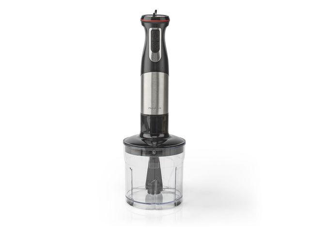 Kompakt 4-i-1-mixersats som innehåller stavmixer, hackare, visp och en praktisk behållare. Ditt kök blir komplett med den här kompakta 4-i-1-mixersatsen som innehåller en stavmixer, en hackare för att till exempel göra blomkålsris, en visp för mjölk till cappuccino eller ägg till en omelett och en praktisk behållare för att blanda eller hälla dina mixade godsaker i. Att blanda och mixa soppor, såser och smoothies har aldrig varit så här enkelt. Mixersatsen är snabbare, mer praktisk och kräver mindre rengöring än en stativmixer. Den har axel och blad i rostfritt stål och flera hastighetsinställningar som gör att den även kan hantera hårda grönsaker och frukt. Vi vill att du ska kunna mixa snabbt, enkelt och ha full kontroll. Därför har den här mixern olika hastighetsinställningar, en turbofunktion och mycket vassa blad av rostfritt stål som skär igenom nästan allt. Det fungerar tack vare motorn på 800W och med endast en knapptryckning. I Nedis 4-i-1-mixersats ingår en behållare på 900ml. Mixa direkt i behållaren med stavmixern och få rätt mängd ingredienser direkt. Hackaren på 500ml fungerar bra när du ska hacka lök, nötter och blomkål medan stavmixern är perfekt för att göra släta soppor, barnmat, juice och smoothies. Alla tillbehör i mixersatsen är diskmaskinssäkra, men även enkla att rengöra med varmt vatten och lite diskmedel. Om du använder stavmixern dagligen rekommenderar vi att du tar bort axeln från mixern och handdiskar den för att behålla den i nyskick. Variabel hastighetskontroll 800W Aluminium/svart