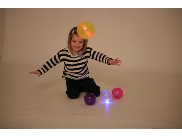 Barn älskar att leka med dessa sensoriska texturerade bollar som lyser upp och blinkar när de studsas. Perfekta för användning i ett sensoriskt område eller för kasta-och-fånga lekar eftersom de är en bekväm storlek för små barn att hantera. Varje boll har en annorlunda yta för nyfikna händer att utforska. 4 ljusa bollar: lila, rosa, gul och genomskinlig, var och en innehåller en färg-LED som varar ca 1200 blinkande cykler. Stödjer följande inlärningsområden: Förståelse av världen - ljus & färg Fysisk utveckling - motorik Fysisk utveckling - hand-öga-koordination Personlig utveckling - sensorisk Personlig utveckling - samarbetslek Mått: 100 mm i diameter Paket om 4 bollar Material: TPU PVC-fri Rekommenderad ålder: från 1 år