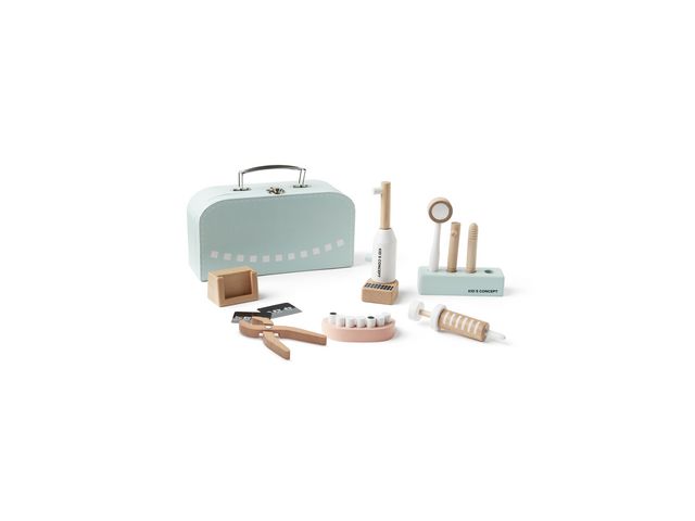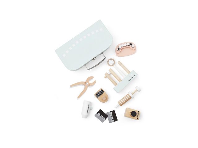 Tandläkarset i FSC-certifierat trä. Vi gillar att gå till tandläkaren, eller hur? Nja kanske inte men låt oss hjälpa till att förbereda barnen för tandläkarbesöket. Att via leken öva på vad tandläkaren kommer att göra när hon eller han undersöka tänderna och förstå att det är viktigt att hålla sina tänder rena. Tandläkarsetets innehåller 19 delar, tre utbytbara verktyg, spegel, tandborst- och putsverktyg att sätta i tandborsthållaren. Knappen på sidan av hållaren går att trycka in. Verktygen kan förvaras i stället. På laddaren finns en liten solpanel för `laddning`. Med röntgen-kameran undersöker man tändernas status och kan titta på röntgenplåtarna. Sju löstagbara tänder sitter i en gom av trä. När man vänder på tänderna har de hål på ena sidan. Med tången drar man ut tänderna. Bedövningssprutan har fjädring så den går att dra upp och skjuta in. Tandläkarsetet kommer i en väska i papp som är enkelt att ta med. Det här tandläkarsetet stimulerar fantasin och vi garanterar många timmars engagerad rollspel och social träning. Detta tränar samtidigt motoriken och även leka och bearbeta i efterhand hur tandläkarbesöket gick till. Material: trä och papp Rekommenderad ålder: från 3 år FSC CE