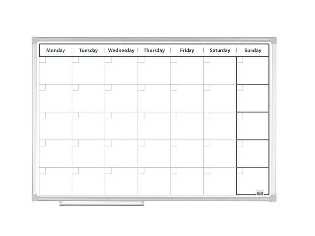 En magnetisk veckoplan med aluminiumram och lackerad yta. Tavlan har en tryckt matris för veckoplanering. Veckodagarna står vågrätt i den övre delen av tavlan. Texten är på engelska. Ingår monteringsset, 3 magneter, whiteboardpenna, pennhylla (30 cm). Magnetisk Storlek: 90x60 cm