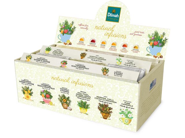 Sätt guldkant på tillvaron med varje tebryggning och låt smakerna ta dig med på en resa! Utforska naturens mångfald med Dilmah Infusion Sortimentslåda örter. Denna serie örtteer är inspirerad av naturens rikedom och presenteras i en stilfull och praktisk displayask tillverkad av kraftig papp. I denna låda finner du sex ljuvliga örtteer, var och en förpackad i individuellt kuverterade tepåsar för enkel användning. Varje tepåse är fylld med en harmonisk blandning av örter och naturliga smaker, som erbjuder en rogivande och uppfriskande teupplevelse. Det bästa av allt är att dessa teer är koffeinfria, vilket gör dem perfekta för avnjutning när som helst på dagen. Ge dig själv förmånen att utforska Dilmahs värld av örtteer och låt dess naturliga smaker föra dig på en resa till avkoppling och välbefinnande. Sex olika smaker: Holy Basil - Ginger - Lemon & Lemon Grass, Moringa - Chilli - Cocoa & Cardamom, Cardamon - Ginger & Orange, Tangarine - Rose - & Grapefruit och Pure Camomile Tio stycken av varje Koffeinfritt: Ja