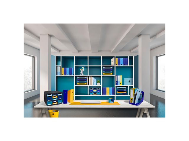 BeeBlue ger ett härligt tillskott av färg i arbetsmiljön, och är skapad med tanken att öka både organisation och entusiasm. BeeBlue tidningsställ kommer i ett set med 4 färger. Hela serien med BeeBlue produkter är tillverkade av återvunnen plast och är Blue Angel-certifierade. Passar för A4+-dokument och är mycket stabila med hög förvaringskapacitet. Detta speciellt designade tidningsställ har dessutom ett fingerhål på ryggen som aldrig blockeras. Passar på kontoret såväl som hemma eller skola. Mått: 345 x 275 x 330mm 25 års garanti Tillverkad i Österrike 100% återvinningsbar Färger: ljusblå, marinblå, saffran och turkos Blue Angel