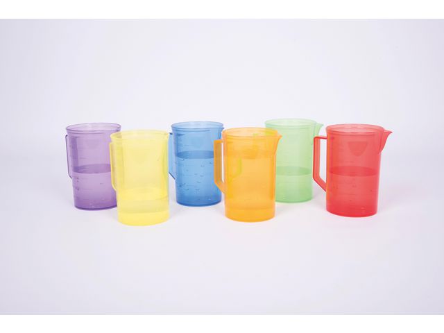 Roliga färgkrus, perfekta storleken för barn att använda i utforskande lek med sand och vatten, för färgblandning och matchning samt för att lära sig om mätning och volym. Volymen är 300 ml och är markerad i 50 ml-steg på varje krus. Färgerna matchar de andra delarna i samma serie så att de kan användas tillsammans för förlängt lekvärde. Stödjer följande inlärningsområden: Förståelse av världen - utforskning Förståelse av världen - färg Personlig utveckling - samarbetslek Matematik - mätning Rekommenderad ålder: från 18månader Förpackning med 6 st Mått: 113 x 77 mm i diameter Volym: 300 ml Material: PP
