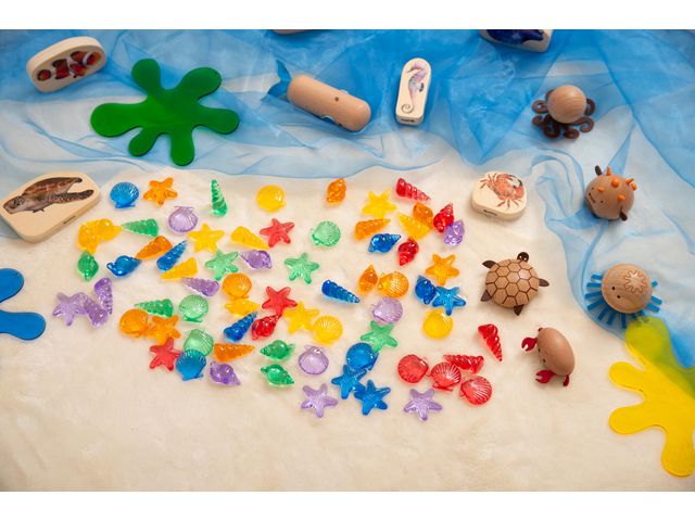 Färgglada detaljerade snäckor och havsdjur för räkning, sortering, mönsterskapande och användning i enkla matematikaktiviteter (addera, subtrahera, dividera eller multiplicera). De genomskinliga färgerna gör dem perfekta för användning på en ljuspanel och de detaljerade funktionerna ger ett taktilt inslag till setet. Inkluderar 4 olika former (sjöstjärna, spiral, mussla och snäcka) i 6 färger (röd, orange, gul, grön, blå och lila) i en praktisk förvaringsburk med lock. Stödjer följande lärandeområden: Matematik - räkning & sortering Fysisk utveckling - motoriska färdigheter Förståelse av världen - färg Uttrycksfull konst & design - fantasifull lek Mått: ca 30-40 mm Material: Akryl