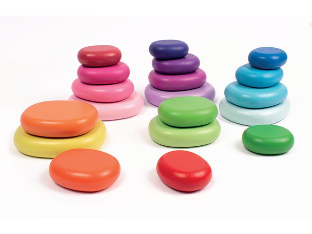 20 st släta färgglada trästenar i olika storlekar som inbjuder till öppen lek. Sortera och lägg dem på rad, rulla eller stapla dem på varandra och bygg torn. Främjar motorik, färglära och kreativitet. Setet innehåller 4 olika storlekar 4,-7,5cm i regnbågsfärger Rekommenderad ålder: från 3 år FSC