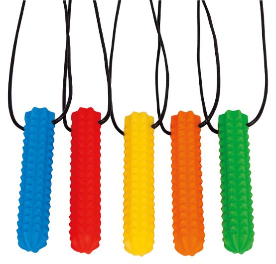 Trygg och lugnande stimulans – sensoriska tugghalsband för barn med tuggbehov. Detta set med 5 sensoriska tugghalsband är utformat för barn som behöver extra stimulans eller har tuggbehov. Halsbanden är tillverkade i mjukt, säkert silikon som är skonsamt mot tänder och tandkött. Perfekt för att främja fokus, minska stress och skapa trygghet i vardagen – både i förskola, skola och hemmamiljö. Antal: 5 halsband Mått: 7,2 × 1,3 cm Längd: ca 32 cm Material: Silikon Mjukt och säkert för tänder och tandkött Rekommenderad ålder: från 3 år