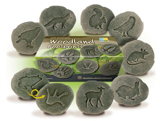 Denna uppsättning engagerande skogsmarksfotspår är ett bra sätt för barn att börja sina skogsutforskningar! Varje sten har ett djurs upphöjda fotavtryck på ena sidan och en bild av djuret indraget i den andra. Ta med stenarna på en gruppvandring för att jämföra dem med alla djurspår som barnen upptäcker (eller förbered några egna om det behövs). Tryck ned fotavtrycket i marken för att kontrollera, vänd sedan stenen för att identifiera vilket djur som lämnat märkena. Vilket djur kan barnen hitta: räv, ekorre, kanin, groda, rådjur, ormvråk, uggla eller mus? När arbetet är klart kan barnen rengöra fotspåren med tvål och vatten innan ett nytt skogsäventyr imorgon. Fotavtrycken är gjorda av en unik stenblandning och är robusta nog att användas i alla väder, både inomhus och utomhus. Innehåller åtta dubbelsidiga stenar Mått: 70 - 80mm Rekommenderad ålder: från 2 år