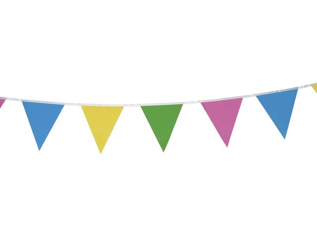 Låt denna pappersgirlang sätta tonen för en minnesvärd och färgsprakande upplevelse! Förhöj feststämningen med vår pappersgirlang komplett med vitt snöre. Girlangen består av 18 vimplar i färgerna blå, gul, grön och rosa, med tryck på båda sidor för en genomtänkt och festlig design. Varje vimpel mäter 16x18 cm, vilket ger en imponerande och färgglad dekoration till din fest eller tillställning. 4m 16x18cm Papper FSC 100%